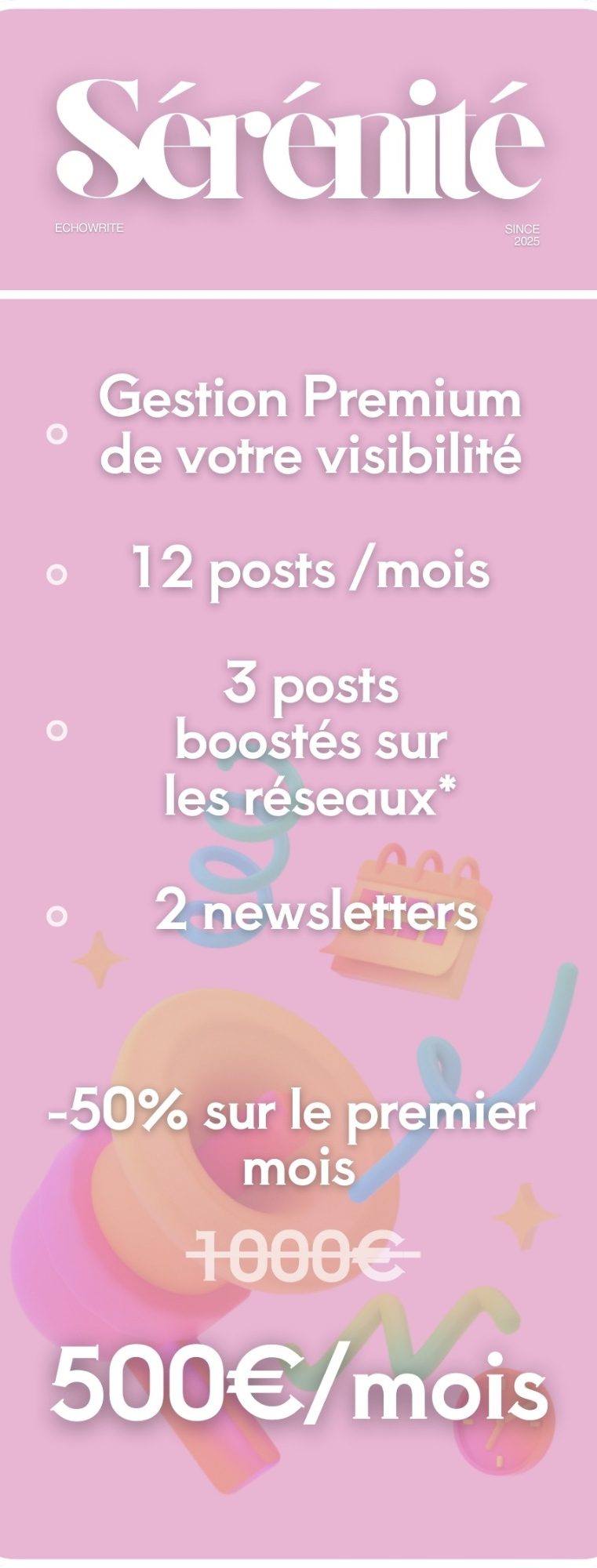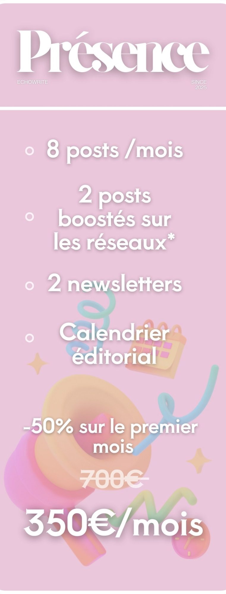 Cette offre s'adresse aux entrepreneurs et entreprises qui souhaitent structurer leur communication et maintenir une présence dans la durée.